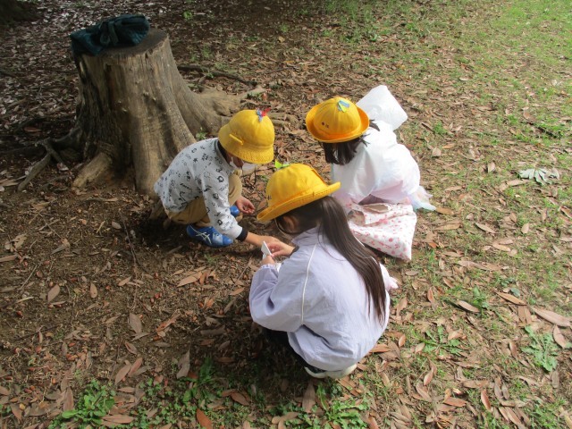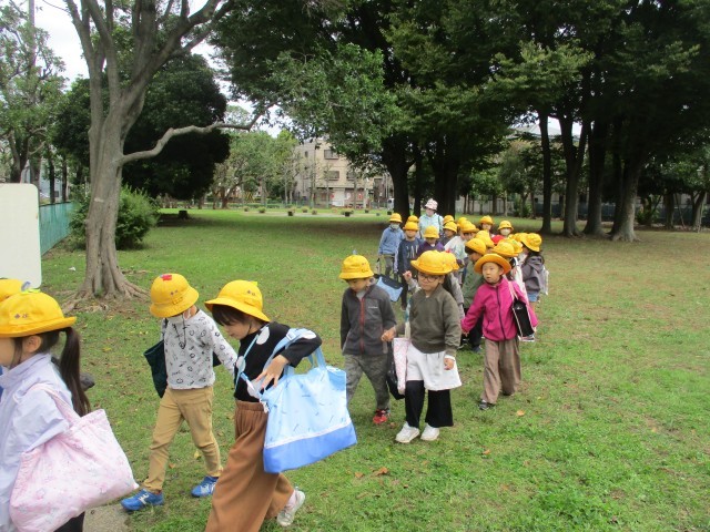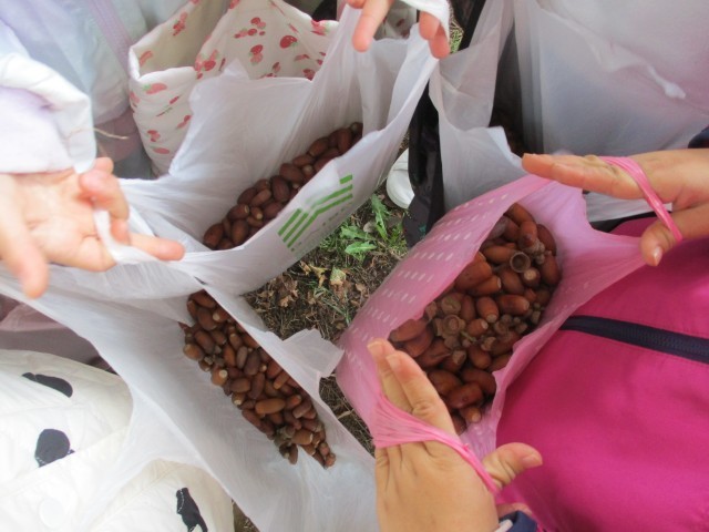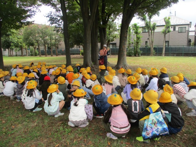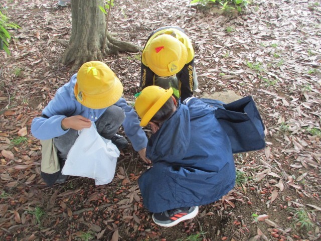 生活科「たのしいあきいっぱい」の学習で、篠崎6広場まで歩いて行き、秋を探しに行きました。木の下には、たくさんのどんぐりや葉が落ちていて、秋の自然に触れることができました。
