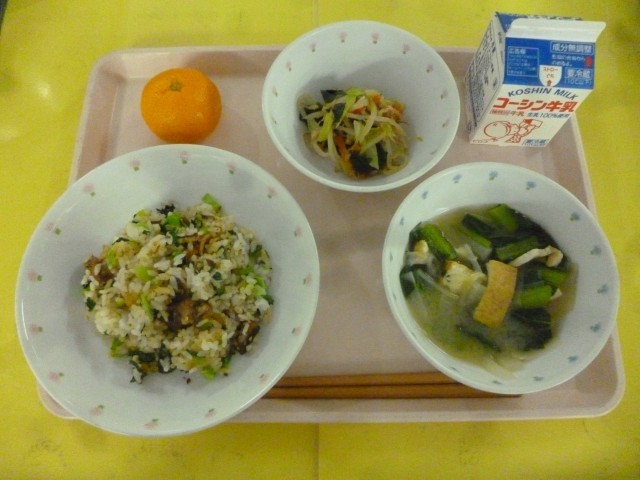 鰯のかば焼きごはん 三色野菜とわかめの和え物