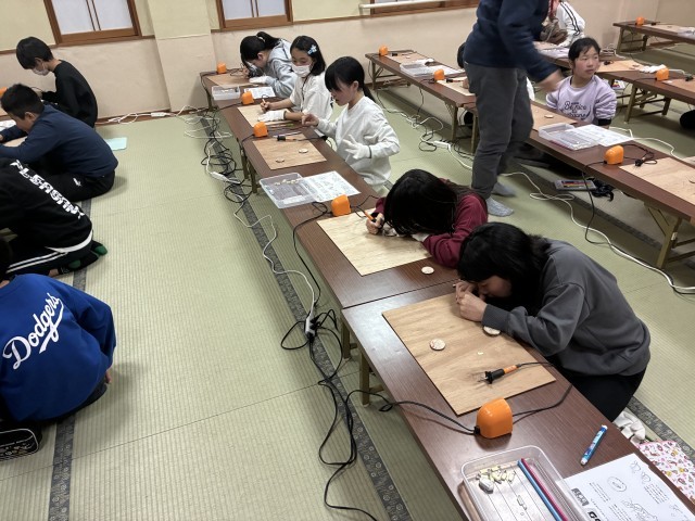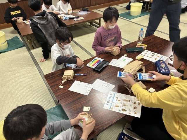 2日目の夜は、木のバッジづくり、魚沼産のミニ米俵づくり、お土産購入をしました。
