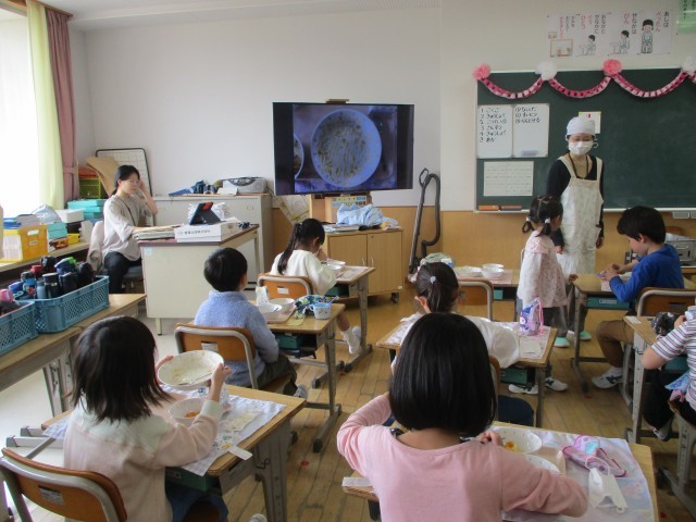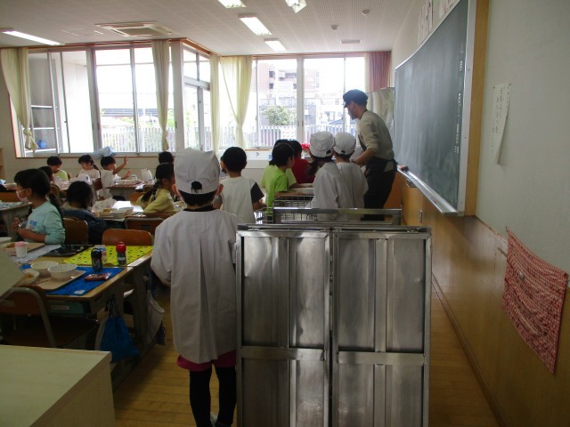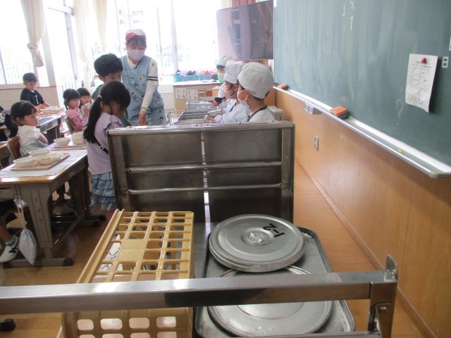 3時間目に栄養士の先生から給食についてのお話を聞き、担任の先生から配膳や配食の仕方を教えていただきkました。給食当番の児童は、慎重に慎重におかずをよそっていました。