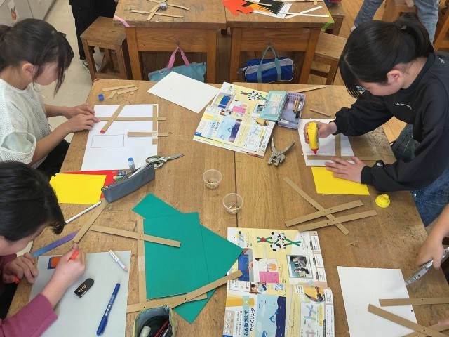 鳩目や割りピンを用いて絵が動く仕組みを試した後、表したいことを考えました。それぞれユニークなアイディアを思いつきそうです。