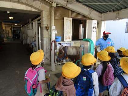 ポニーランドの厩舎を見学しました。馬は人間より体温が高いそうです。ごん太くん(馬)は扇風機に当たって気持ちよさそうでした。