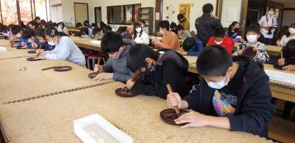 日光彫り頑張っています 窓の外には紅葉も見られます