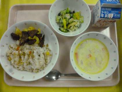 「ピラフ」は米をバターで炒めて具を入れ、スープで炊いた洋風の炊き込みご飯で、ヨーロッパやアジアなどの多くの国で親しまれています。今日の給食のピラフは、バターではなくサラダ油を使用し、皆が食べられるように作りました。