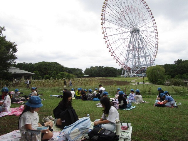 観覧車を見ながら外でみんなで食べるお弁当、とてもおいしかったです。