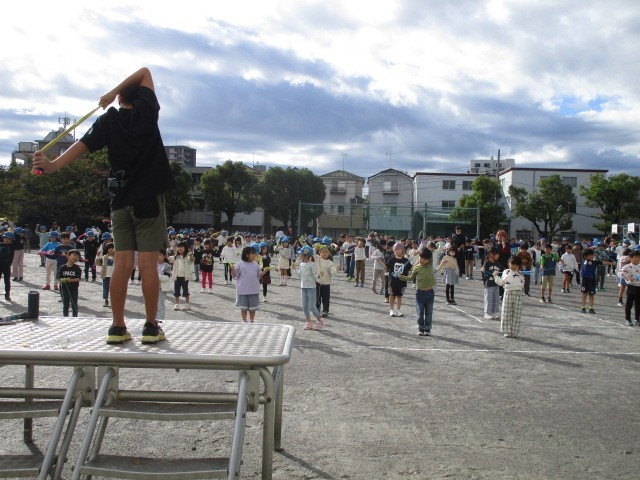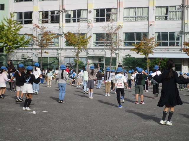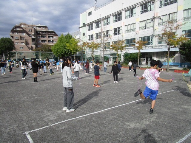 今朝は朝会の時間を使ってリズムなわとびに全校で取り組みました。
