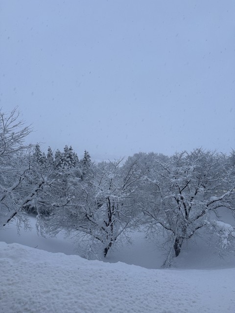 窓の外には、一面に雪景色が広がっています。