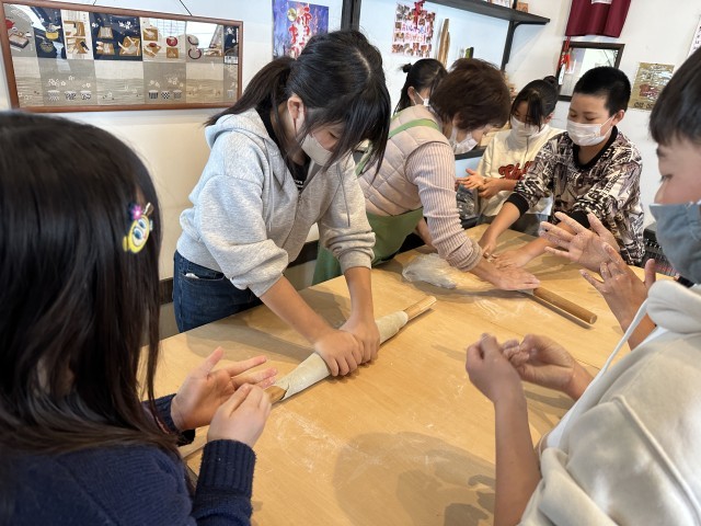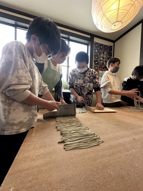 お店の方に教えて頂きながら、みんなでこねて、のばして、切っていきました。包丁を使う時は、みんな真剣。細く切るのに苦戦しました。