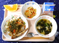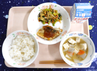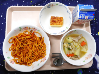 今日は給食室手作りのオニオンベーコンパンです。生地に炒めたベーコンと玉ねぎが入っています。手でこねたパンはしっとりふわふわでした♪