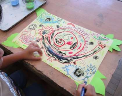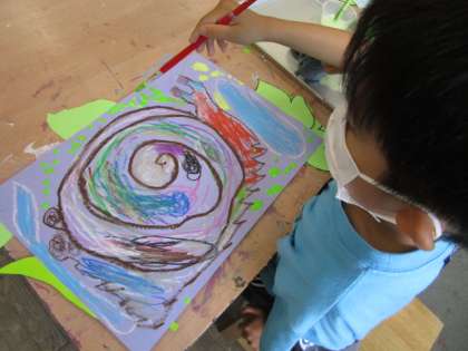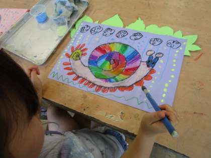 今日はカタツムリの周りと飾りの葉に【点描】という技法で絵の具をぬっていきます。筆の動かし方や絵の具の重なりを楽しみながら描きました。
