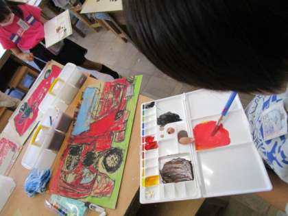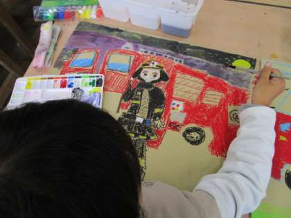 働く消防車がいる場所を考えて、絵の具で彩色を進めました。