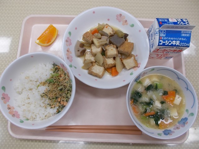 今日のメニューは、麦ごはん、小松菜と鮭のふりかけ、春野菜の炊き合わせ、すりごまの味噌汁、オレンジ、牛乳です。