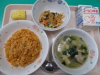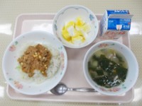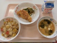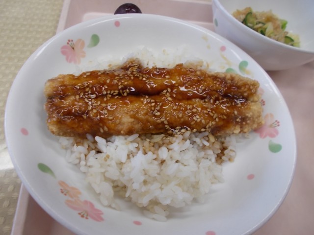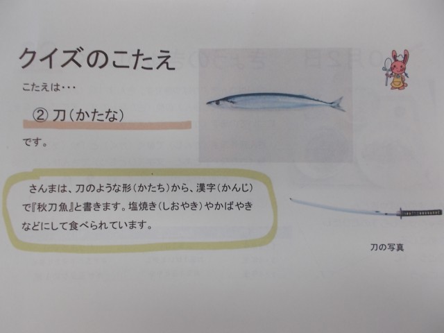 今日の給食のメニューは、さんまのかば焼き丼、キャベツとしらすのおひたし、なめこ汁、ぶどう、牛乳です。今日は、さんまのかば焼き丼です。さんまは、秋にたくさんとれる旬の魚です。そこで、さんまについての漢字クイズです。さんまを漢字で書くと「秋」と「魚」と、あと一文字は何でしょう?①石 ②刀 ③海 答えは・・・②の「刀」です。さんまは、刀のような形をしているので、漢字で「秋刀魚」と書きます。塩焼きやかば焼きなどにして食べられています。