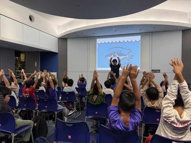 水族園では、初めに団体プログラム「さがせ、いろいろなさかな」に参加しました。魚の形や泳ぎ方、暮らしている場所などを教えていただきました。