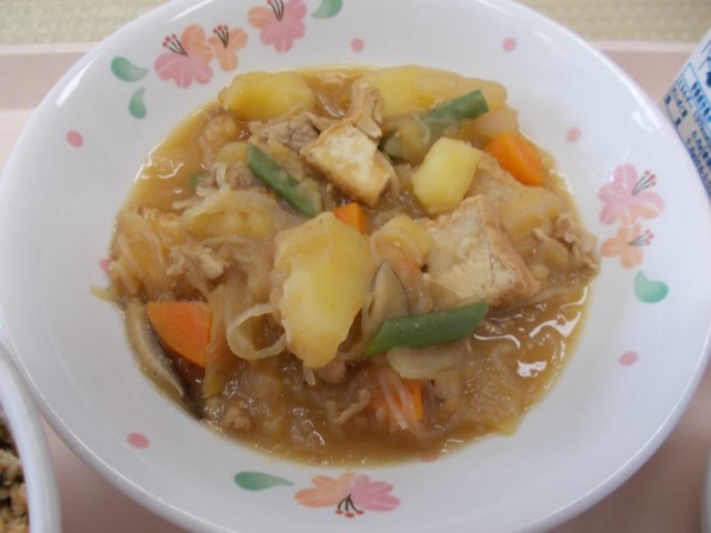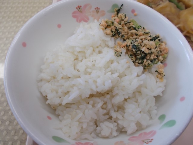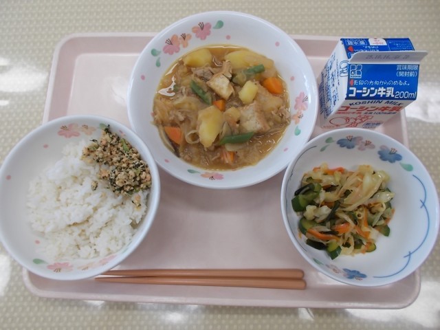 今日の給食のメニューは、ごはん、小松菜と鮭のふりかけ、肉じゃが、和風わかめサラダ、牛乳です。10月になり1週間が経ちました。10月の給食目標は「食後の過ごし方を工夫しましょう」です。食後は、食べたものをしっかり消化するために、ゆったりと過ごすとよいです。すぐに激しい運動をすると、胃や腸がうまく働かなくなるため、お腹が痛くなることがあります。お腹の調子と相談しながら、落ち着いて過ごすことが大切です。