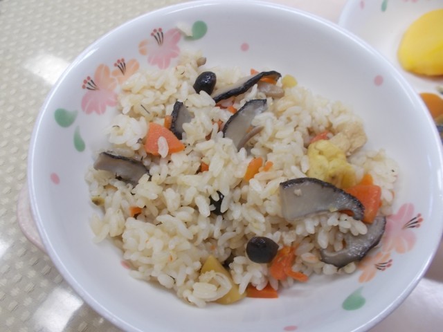 今日の給食のメニューは、秋の香りごはん、さわらの味噌だれ焼き、磯香和え、かきたま汁、柿、牛乳です。今日は、秋の食材であるきのこと栗の入った「秋の香りごはん」を作りました。涼しく感じる日が増え、秋らしい季節になりました。昼と夜の気温差が大きく体調管理が難しい時期でもあります。秋は、食欲の秋と言われ、旬を迎える食べ物がたくさんあります。おいしいものをたくさん食べて、丈夫な体を作れるといいですね。