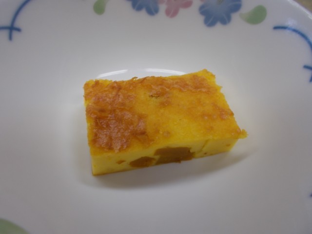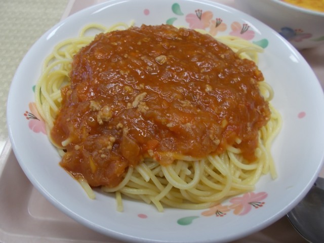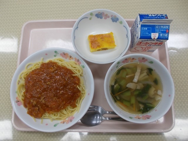 今日の給食のメニューは、スパゲティミートソース、きのこのスープ、パンプキンチーズケーキ、牛乳です。今日は、ハロウィン献立です。ハロウィンにちなんで、かぼちゃを使ったチーズケーキを作りました。ハロウィンは、今から2000年ほど前のヨーロッパで行われていた、秋の収穫のお祝いと悪霊を追い払う祭りが始まりだと言われています。ハロウィンの特徴であるかぼちゃの飾りは、かぼちゃをくりぬいて目や口の穴を開け、中にろうそくを入れて照らして使います。悪い霊を怖がらせて追い払うために恐い顔のおばけかぼちゃを作り、ハロウィンの夜に家の外に置くそうです。
