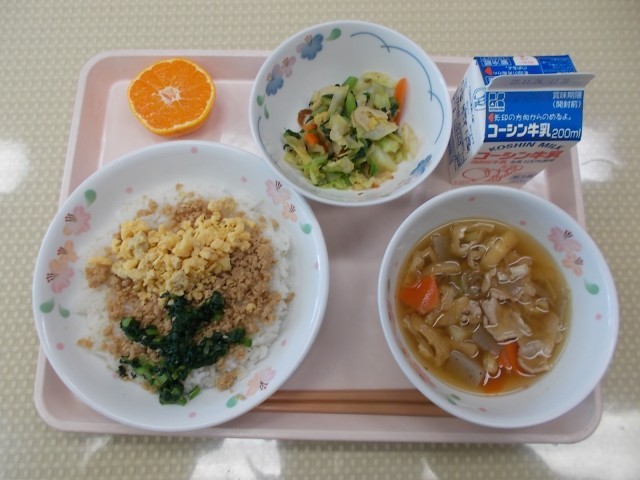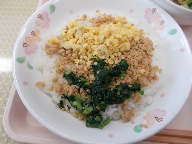 今日は、展覧会献立です。メニューは、3色そぼろごはん、小松菜とちくわの和え物、あんかけ汁、みかん(菊花型)、牛乳です。今日は、展覧会の「みんなで描くぞ!私たちの菊」に合わせて、給食室でも菊の絵をかきました。3色ごはんの具、「とりそぼろ」「たまご(花)」「小松菜(茎)」を使って、ごはんの上にかきました。色々な具の味を楽しみながらいただきました。