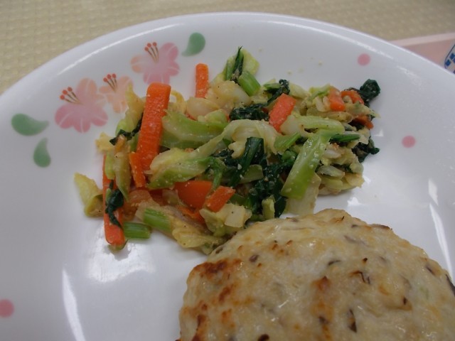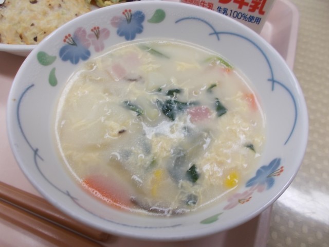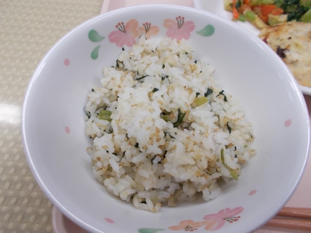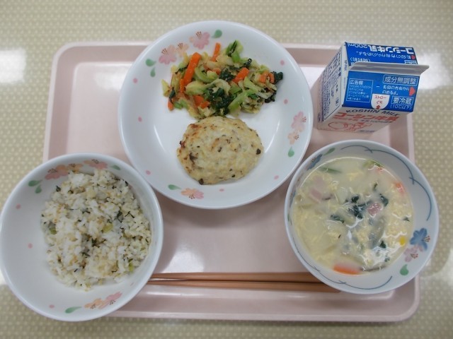 今日は、全校一斉小松菜給食の日。メニューは、小松菜ごはん、しいたけ入りつくね焼き、ごま和え、小松菜とベーコンのかきたまみそ汁、牛乳です。今年も11月17日と18日の2日間、江戸川区のすべての小・中学校に、江戸川区の小松菜農家の人たちから無料で小松菜が届けられます。これは、江戸川区の特産品である小松菜をぜひみんなに味わってほしいという「JA東京グループ食農教育応援事業」の取組です。今日の給食には、合計15kgの小松菜が使われています。江戸川区の味を感謝していただきました。