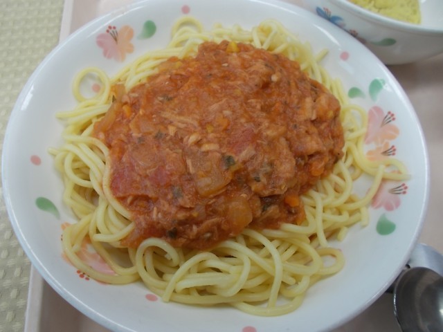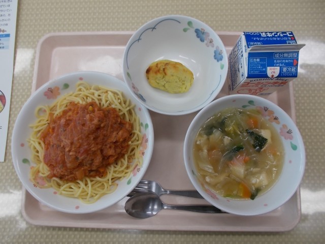 今日の給食のメニューは、ツナとトマトのスパゲッティー、ベーコンと豆腐のスープ、スイートポテト、牛乳です。今日のスイートポテトは、給食室手作りです。さつまいもの皮をむき、蒸してから牛乳・生クリーム・砂糖・バターを混ぜています。一つ一つ丁寧に丸めてから、オーブンで焼いています。さつまいもは今が旬で、甘みもあり、おいしい季節です。今日のさつまいもは、千葉県の「シルクスイート」という種類です。季節の味を楽しみました。