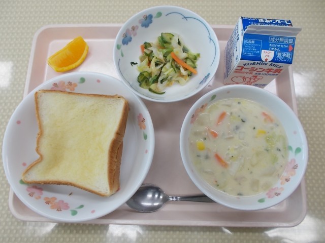 今日の給食のメニューは、はちみつレモントースト、白菜と貝のクリーム煮、キャロットドレッシングサラダ、オレンジ、牛乳です。今日は「レモン」と「はちみつ」を使った「はちみつレモントースト」を作りました。はちみつは、のどを守る効果があります。はちみつは、保湿効果がとても高く、乾燥からのどの粘膜を守ります。また、のどについた菌を倒してくれます。のどからくる風邪の予防のために、はちみつスプーン1杯をそのままなめたり、お湯に溶かして飲んだりすると効果的です。