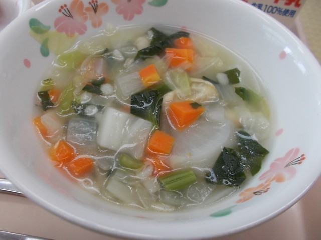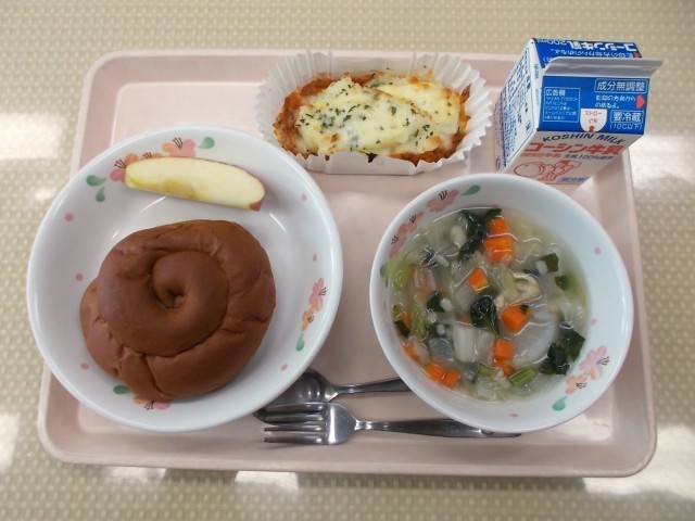 今日の給食は、イギリス料理の献立です。メニューは、ココアパン、シェパーズパイ(ミートポテトグラタン)、スコッチブロス(麦入り野菜スープ)、りんご、牛乳です。初めにイギリスの食文化の紹介です。イギリスは、国の半分が牧草地や牧場のため、肉類や乳製品を多く食べます。また、海に囲まれているため、魚も食べられています。「フィッシュアンドチップス」という伝統的な料理があります。続いてメニュー紹介です。「シェパーズパイ」~イギリスの家庭料理です。ミートソースの上にマッシュポテト、チーズをのせて焼いています。イギリスでは、マッシュポテトをかぶせて焼いたものを「パイ」と呼びます。シェパーズは「羊飼い」という意味があり、本場では羊肉を使って作ります。給食では「豚肉」を使って作りました。「スコッチブロス」~イギリスの北部にある「スコットランド地方」のスープです。肉や野菜、押し麦を入れてコトコト煮た栄養たっぷりな料理です。冬の寒い季節にパンと一緒に食べます。
