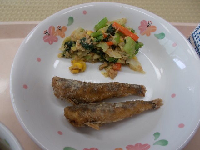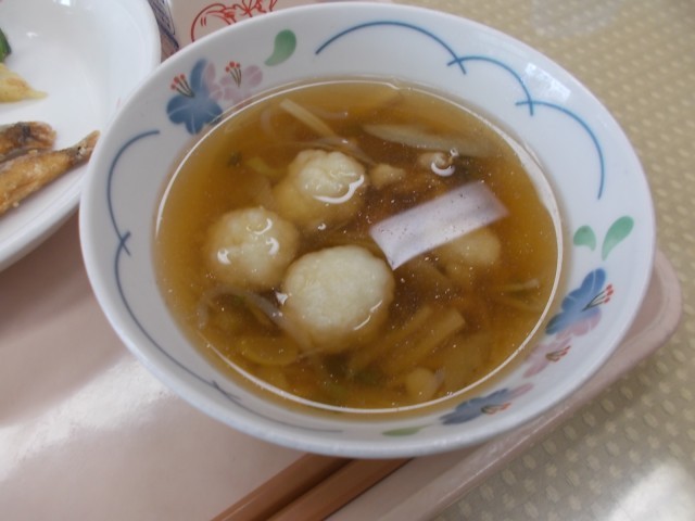 今日の給食は、秋田県の郷土料理献立です。メニューは、小松菜きつねごはん、めひかりの唐揚げ、ツナと野菜のごま和え、だまこ汁、牛乳です。秋田県は、東北地方の北西部にあり、日本海に面しています。秋田県は何と言ってもお米が有名で、全国6番目の生産量です。「あきたこまち」などのブランド米もあります。その他の特産物には、「はたはた」「せり」「比内鶏」「りんご」などがあります。今日の給食では、特産物の「はたはた」を出したかったのですが、今年はあまりとれていないため、出せませんでした。代わりに愛知県産の「めひかり」にしました。「だまこ汁」~だまこ汁の「だまこ」は、炊いたお米をすりつぶして丸めて作ります。「きりたんぽ」と似た食べ物です。「だまこ」はお手玉のことで、お手玉のように丸めて作ることから名前がつきました。鶏のだしにせりやねぎなど秋田のおいしい野菜を加えて煮ます。今日は、ごはんをつぶし丸めてからオーブンで焼いて作りました。周りはカリッと中はもっちりしています。