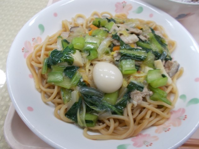 今日の給食のメニューは、小松菜のあんかけ焼きそば、豆腐とえのきのスープ、小松菜ドーナッツ、牛乳です。今日は学校給食週間3日目。江戸川区産の「小松菜」をたっぷり使った献立にしました。すべての献立に小松菜が入っています。地域で作られる食材を使うことを「地産地消」といいます。小松菜ドーナッツは調理師さんの手作りで、一つ一つ形を作ったものです。よく味わっていただきました。