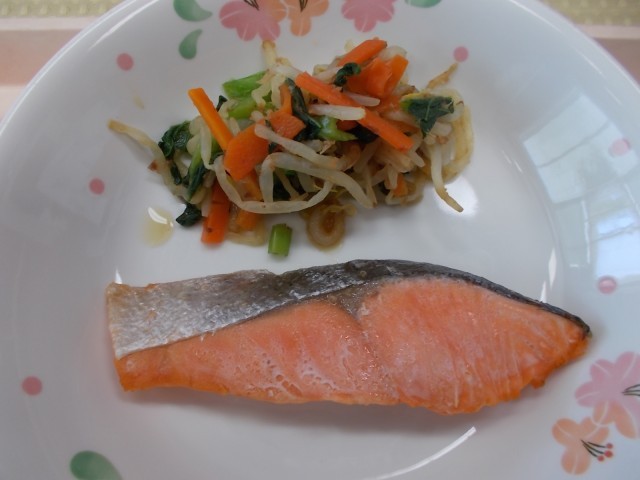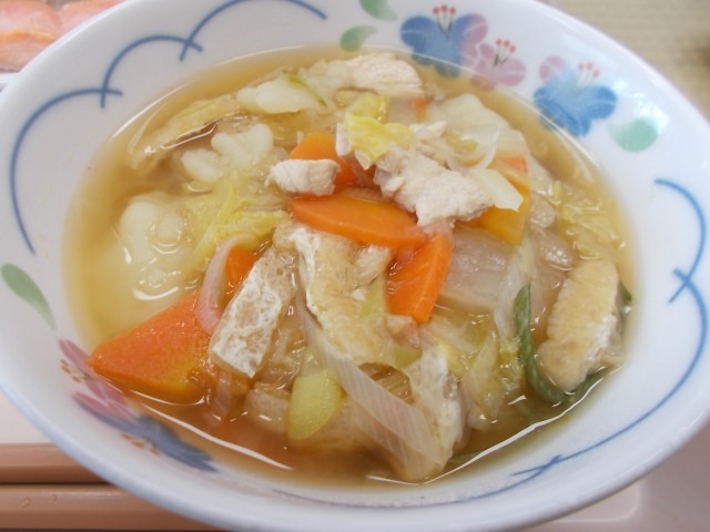 今日の給食のメニューは、麦ごはん、鮭の塩焼き、小松菜のおひたし、すいとん、みかん、牛乳です。今日は、学校給食週間4日目です。日本で初めて出された学校給食を再現しました。学校給食は、明治22年(1889年、今から137年前)、山形県鶴岡町の忠愛(ちゅうあい)小学校で、弁当を持ってこられない子供たちのために始まりました。この時の献立は「おにぎり、塩鮭、漬物」でした。