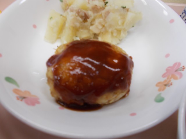 今日は、SDGs献立です。メニューは、ごはん、コノシロのハンバーグ、ジャーマンポテト、皮つきかぶのみそ汁、みかん、牛乳です。東京湾でとれた「コノシロ」という魚を使って、ハンバーグを作りました。東京湾でとれた魚を使うことで、地産地消になります。また、みそ汁は、かぶの葉と皮を入れて作り、捨てる食材を減らしています。