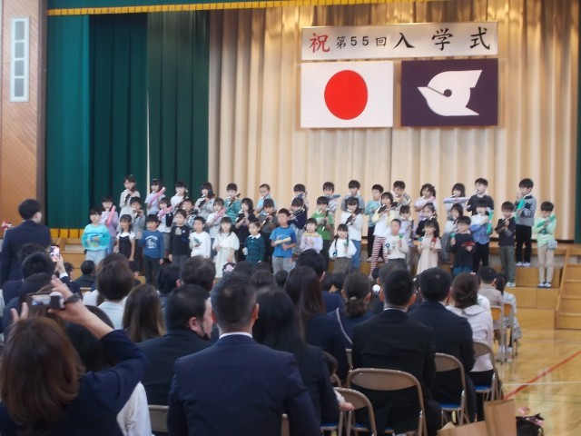 4月6日午前10時から、下鎌田東小学校第55回入学式が行われました。多くのご来賓の皆様、保護者の皆様、教職員の祝福の中、57名の元気な1年生が入学しました。校長からは、お祝いと共に55周年を迎える本校の1年生として、学校を一層明るくしてください、という話があり、みんなで「Go Go 1年生! Go Go 東っ子!」と元気な声で言いました。入学式の後半には、新2年生からの合奏のプレゼントがあり、2年生が中心になって、校歌を元気いっぱいに歌いました。