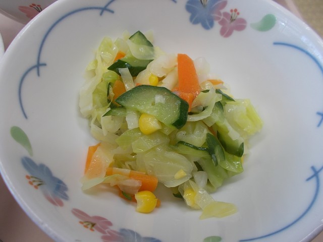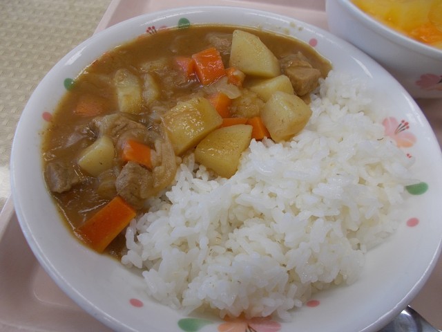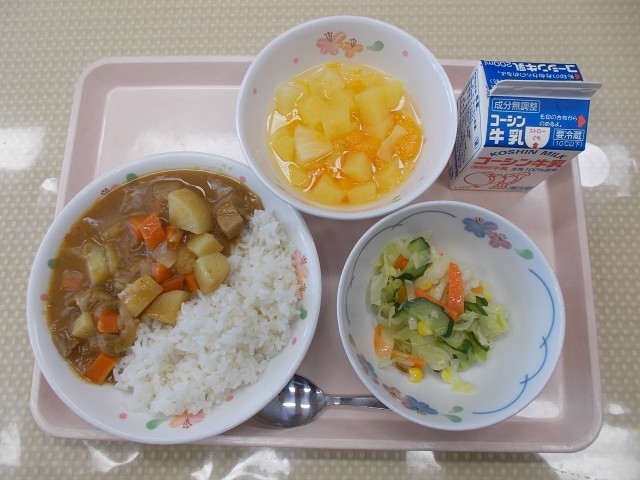 今日の給食のメニューは、カレーライス、フレッシュサラダ、オレンジ寒天ポンチ、牛乳です。今日から1年生も給食が始まりました。今日は給食室から1年生へのメッセージを紹介します。「1年生のみなさん、入学おめでとうございます。1年生は今日から給食が始まりました。苦手な食べ物にも挑戦しましょう!」 学校のカレーは、全て手作りです。甘いカレーと辛いカレーの2種類を作って、ちょうどよい辛さになるように調整しています。