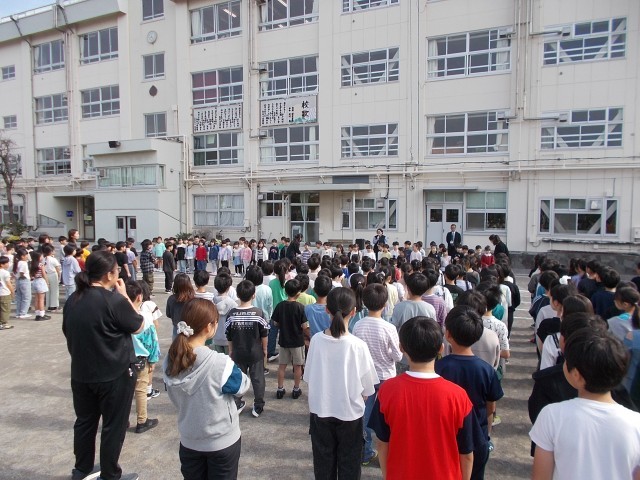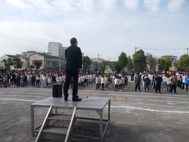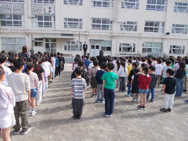 本日(4月13日)、令和8年度第1回全校朝会が行われました。今日は初めに1年生との対面式を行いました。1年生は、2~6年生と正式に顔を合わせ、「よろしくお願いします。」の挨拶の後、全校朝会の列に並びました。校長からは、全校朝会ではこんな話をしますという話に続いて、最近うれしかったことと子供たちにがんばってほしいこと(朝のあいさつを明るく元気に!)の話がありました。そして、発足したばかりの代表委員会から、55周年キャラクター「しもっち」の案が6つに絞られたので投票をお願いししますという話がありました。