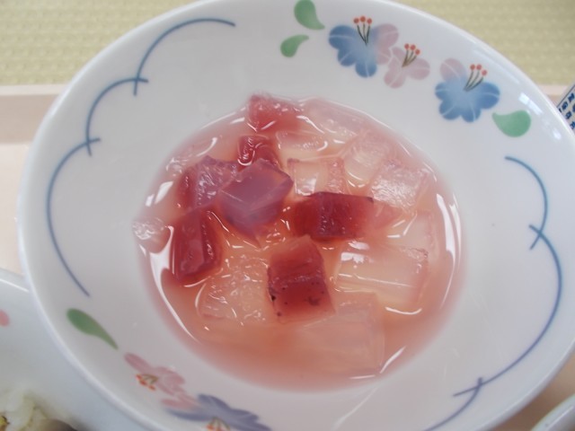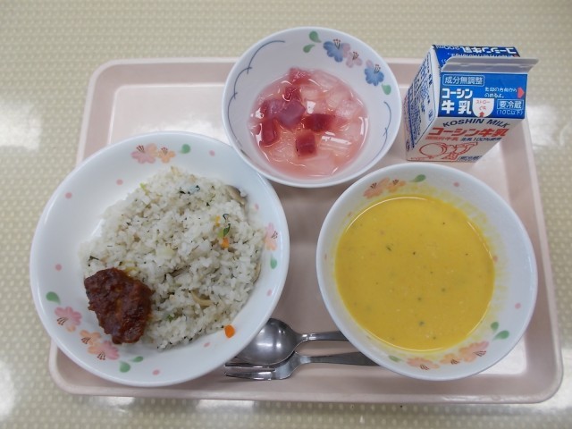 今日の給食のメニューは、きのこピラフ、レバーのマリアナソース、にんじんのポタージュ、ブルーベリーポンチ、牛乳です。今日は、10月10日、目の愛護デーです。10を横に倒すと目と眉の形に見えることからこの日になったそうです。50年前ごろに失明予防の運動として始まったそうです。今日の給食には、目によい食べ物が使われています。目の健康について考えながらいただきました。
