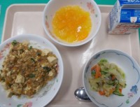 今日の給食は、長崎県の郷土料理で、メニューは、長崎ちゃんぽん、浦上そぼろ、フルーツかんざらし、牛乳です。一品ずつ紹介します。「長崎ちゃんぽん」~「ちゃんぽん」という言葉には、「混ぜ合わせる」という意味があります。ちゃんぽんは、中国出身の料理人が安くて栄養のあるものを食べさせたいと学生のために考えた料理と言われています。今日は、とんこつだしに野菜や魚介、かまぼこを入れて作りました。 「浦上そぼろ」~そぼろと聞くと、ひき肉やみじん切りの形をイメージしますが、この「そぼろ」は長崎県の方言で、「せん切りの油いため」のことです。 「フルーツかんざらし」~「かんざらし」は、長崎県島原地区に昔からあるスイーツです。白玉に「はちみつ」や「ざらめ」などのみつをかけるシンプルなスイーツですが、給食ではフルーツも入れて、みつには黒糖を少し混ぜています。
