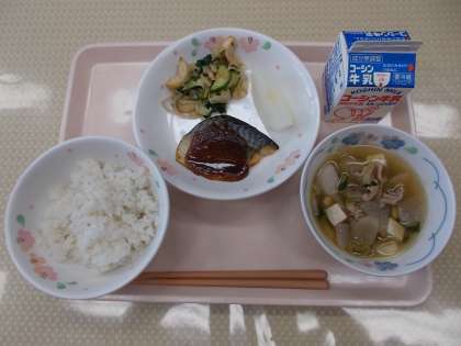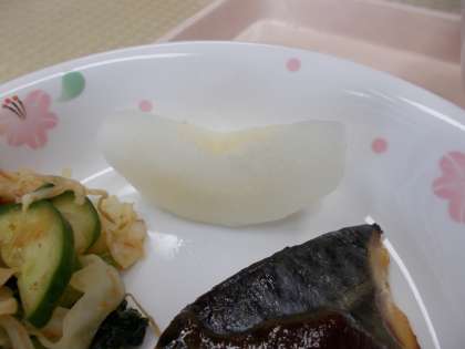 今日の給食のメニューは、ごはん、さばのみそ焼き、小松菜とちくわの和え物、けんちん汁、なし、牛乳です。今日の果物は、8月から9月が旬の「なし」です。日本で食べられているなしの種類は50種類以上あり、種類によって旬が違います。早いものは7月から収穫が始まり、一番遅いなしは11月に収穫します。今日のなしは、千葉県産の「あきづき」という種類で、酸味が少なく甘くてジューシーな味が特徴です。季節を感じながら味わっていただきました。