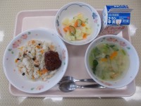 今日の給食のメニューは、マーボー丼、こんにゃくサラダ、わかめスープ、牛乳です。2月の給食目標は「食べ物の働きを考えましょう」です。食べ物には、おもに3つの栄養があります。赤色の「血や肉になる食品」、黄色の「熱や力になる食品」、緑色の「体の調子を整える食品」です。3つの栄養をバランスよく食べることで健康を保つことができます。献立表にも、3つの色に分けて、使う食品が書いてあります。どの食べ物がどの色なのか考えながらいただきました。