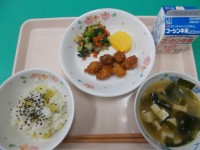 今日の給食のメニューは、中華おこわ、ししゃもの天ぷら、春雨サラダ、中華風コーンスープ、牛乳です。今日は、5月5日にちなんだ、こどもの日給食です。こどもの日は、「こどもの幸せを願い、親に感謝する日」として、祝日に定められました。こどもの日には、「ちまき」や「かしわもち」を食べる風習があります。給食では、中華おこわを作りました。竹の皮では包んでいませんが、ちまき風の味わいです。