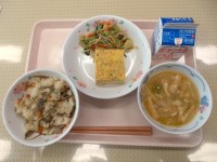 今日の給食のメニューは、フィッシュバーガー、アーモンドのサラダ、ミネストローネスープ、牛乳です。今日は、野菜の話です。野菜は1回の食事で生野菜なら両手に1杯分、温野菜なら片手に1杯分を食べることが目標です。給食では、野菜をゆでているので、片手に1杯分が目安です。今日のフィッシュバーガーには、ゆでたキャベツをはさみました。