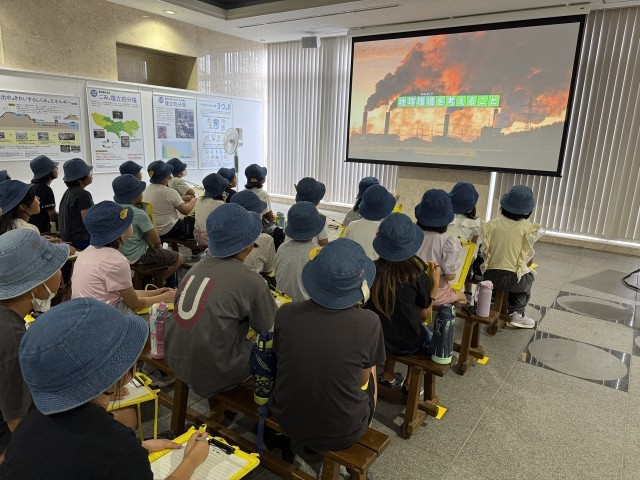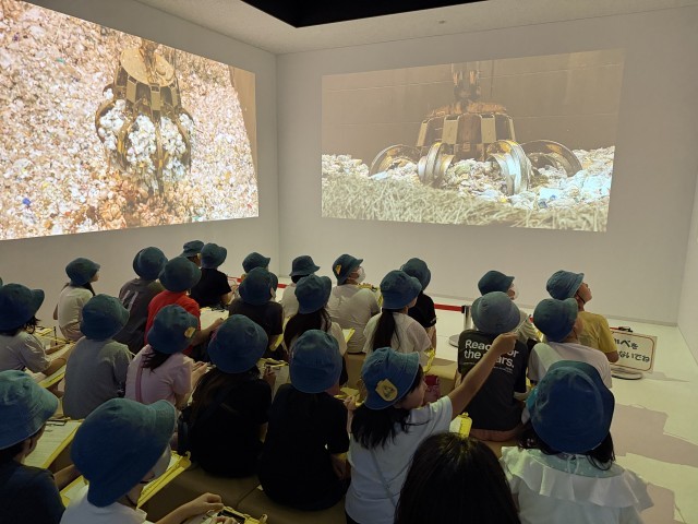 中央防波堤埋め立て処分場に到着しました。まず初めに環境学習ホールでビデオを見ながら学習しました。