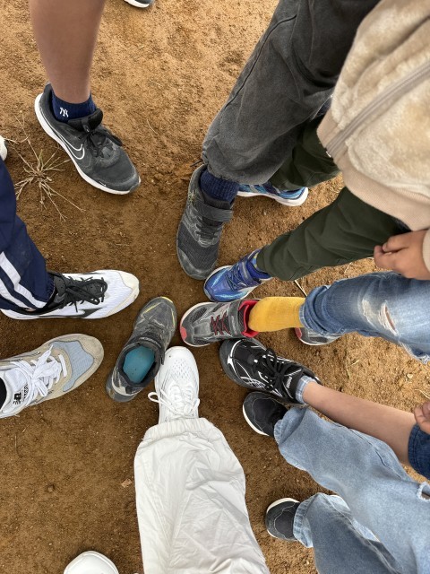 広尾防災公園に着くと、なかよし班で遊びました。2枚目の写真は、鬼ごっこの鬼を決めている様子です。