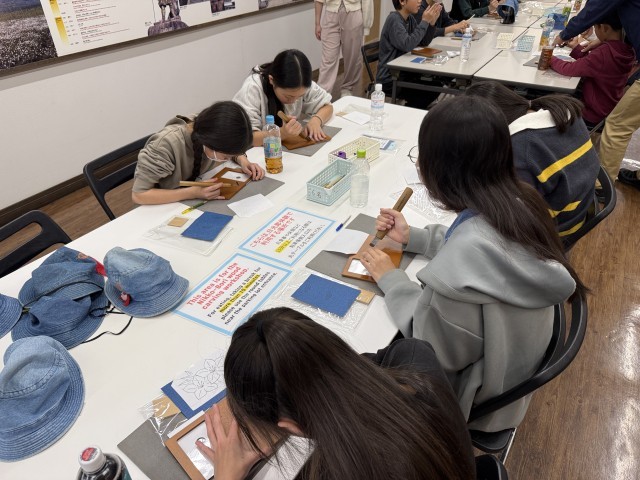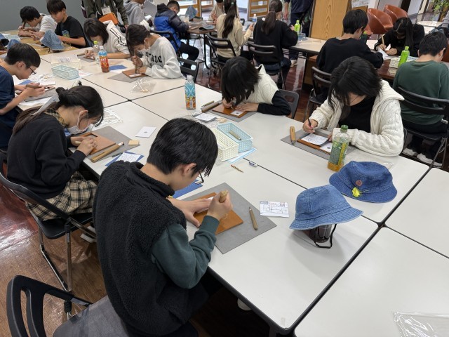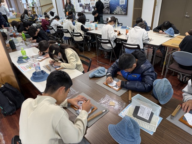 日光彫り体験が続いています。初めて使う日光ひっかき刀に苦戦しながらも集中して取り組んでいます。