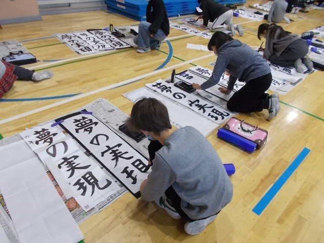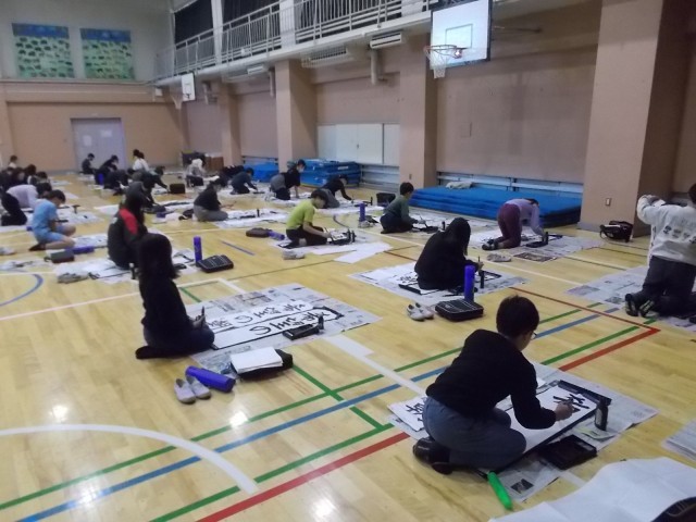 3年生から始めた習字ですが、書初めはだるま筆を使って書くため広い場所を使い体を使って書きます。