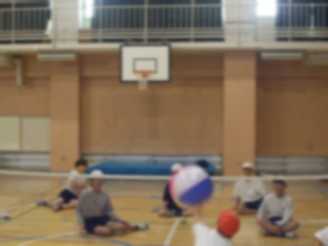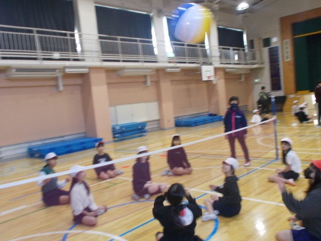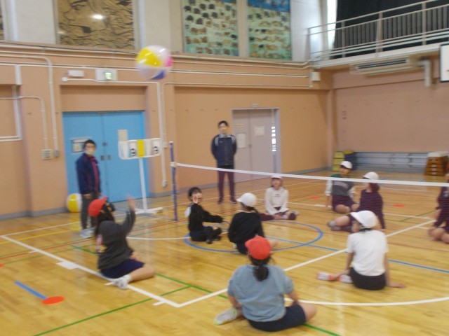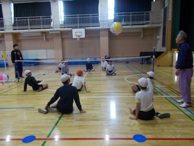 大きなボールを使い、座ったままで行うバレーボールで子供たちも楽しくそうに行っていました。