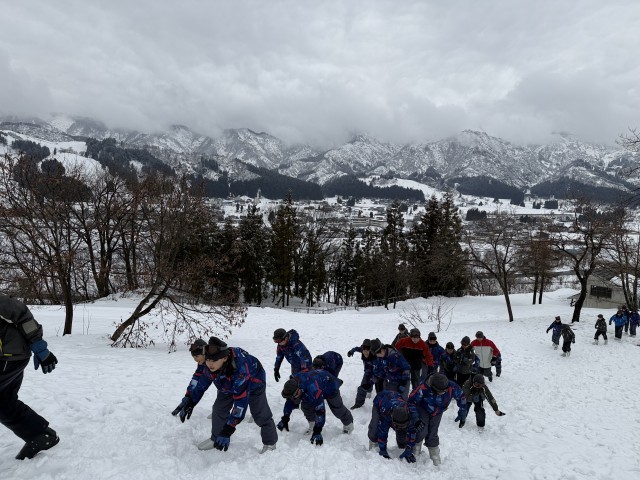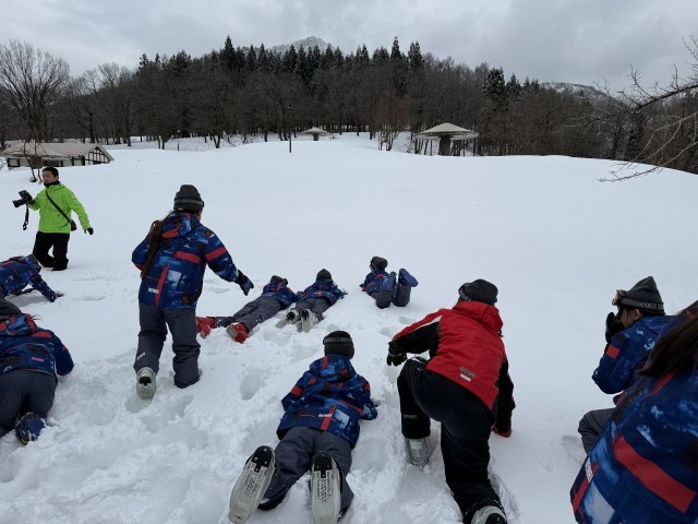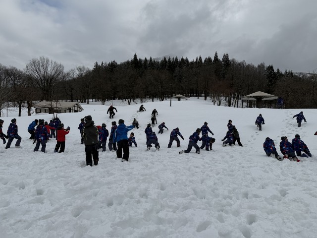 予定よりも少し早く、塩沢江戸川荘に到着しました。雪は、例年より少ないようでが、子供たちは一面に広がる雪景色にとても嬉しそうです。開校式を行い、お弁当タイムです。