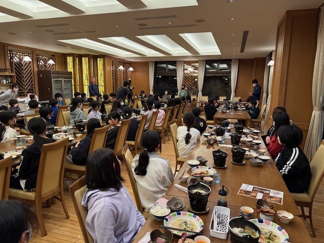 ウインタースクール2日目の夕飯です。スキーでたくさん体を動かした後の食事は、さらにおいしさ倍増で、とてもよく食べていました。