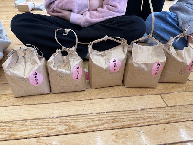 朝食が終わり、米袋制作を行いました。袋に絵を描き、魚沼産コシヒカリを1016g量りとって詰めます。袋が16gなので中身がちょうど1kgになります。いいお土産ができました。
