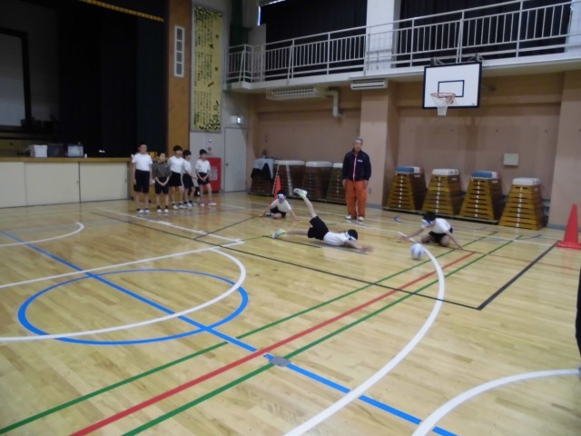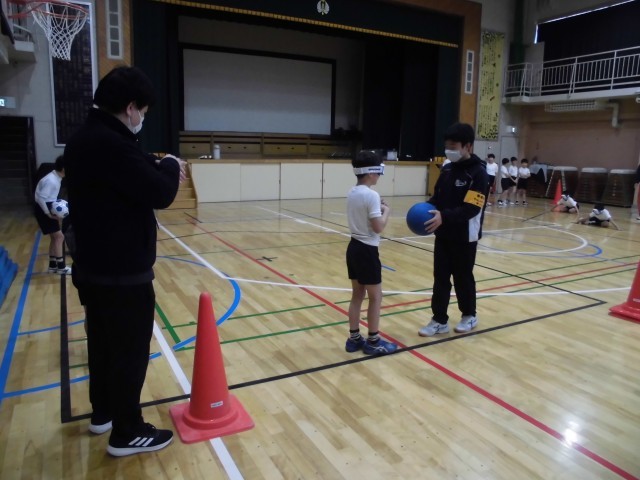 意外と重い球を持って、放るということを練習して点数を競いました。体育とは一味違うスポーツで、子供たちは興味津々でした。