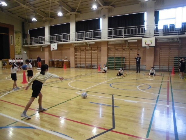 パラスポーツ体験、今日は3年生がゴールボールを行いました。チャレンジザドリームできている中学生も一緒に体育館で思いっきり楽しみました。