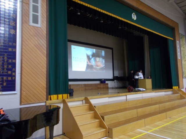 今朝の児童集会は、給食委員会の発表でした。給食について知ってもらおうと、「栄養」「献立の立て方」「給食室の裏側」「給食の豆知識」の4つのテーマをクイズを交えながら、分かりやすく発表しました。プレゼンの画面も子供たちが作成し、写真や動画をたくさん入れた工夫した内容でした。